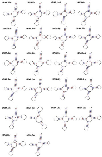 The total size of the two rRNA genes (12S and 16S) was 2526 bp, and they were flanked by tRNAPhe and tRNALeu2 (Table 1, Figure 1). We identified 22 tRNA genes with a total size of 1511 bp, which varied in length from 60 (tRNASer) to 75 (tRNALeu2) bp (Table 1). The H-strand contained 14 tRNA genes, and eight tRNA genes were encoded by the L-strand. All tRNA genes exhibited the cloverleaf secondary structure except two of them, tRNALys and tRNASer (Figure 3). Non-coding regions comprised the origin of replication, the intergenic spacers, and the control region. The origin of replication possessed 31 bp and was located between tRNAAsn and tRNACys. In addition, with a total length of 910 bp, the control region (D-loop) was flanked by tRNAPro and tRNAPhe genes (Table 1, Figure 1).