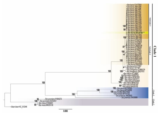 - Hiendleder, S.; Lewalski, H.; Janke, A. Complete Mitochondrial Genomes of Bos taurus and Bos indicus Provide New Insights into Intra-Species Variation, Taxonomy and Domestication. Cytogenet Genome Res 2008, 120, 150–156. [Google Scholar] [CrossRef]