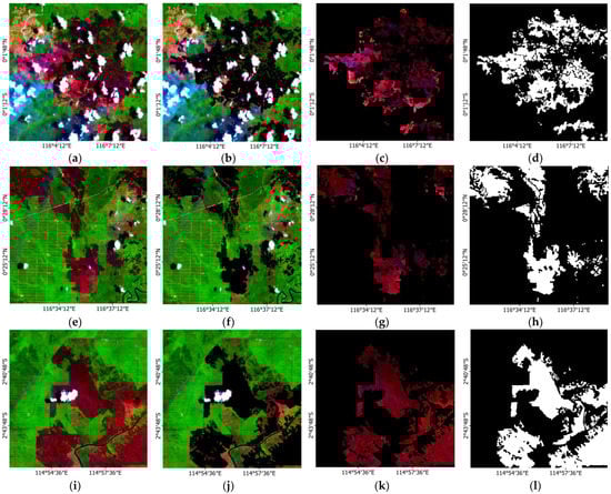 Sample of three image subsets (a,e,i) in false color composite (R = 7, G = 5, B = 4), image subsets with the burned areas masked in black color (b,f,j), image subsets with background masked in black color (c,g,k), and the burned area masks in binary images (d,h,l).