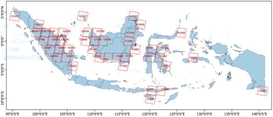 The burned area dataset was created from Landsat-8 OLI multispectral images with a spatial resolution of 30 m. We used Landsat-8 scenes from L1GT and L1TP product levels that have been geometrically corrected [14]. The process of scene selection was carried out by manually checking one-by-one from many Landsat-8 scenes taken between the years 2019 and 2021. As a result, 81 Landsat-8 scenes were selected from several regions in Indonesia with various ecological diversity backgrounds, such as forest, shrub, grassland, waterbody, bare land, and settlement. The selected scenes are spread over 43 path row locations, as depicted in Figure 2.