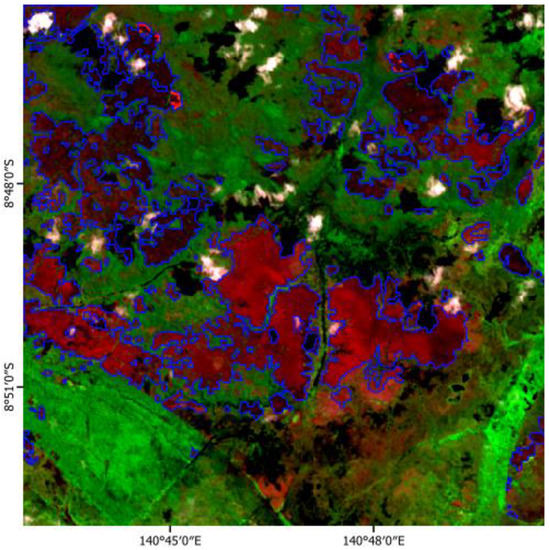 The polygons (blue line) are delineated along the border of burned areas without including the background, such as bare land, vegetation, thick cloud, and shadow.