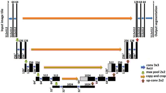 To test the performance of the dataset, we have also used our dataset for training the model of U-Net (Figure 5). We trained the model using quicklook images of 512 × 512 pixels containing band SWIR-2, NIR, and red as its color composite. Each image was rotated by 90, 180, and 270 degrees during the data augmentation process before it passed through the model. Eighty percent of the dataset was used for the training and twenty percent for the validation. During network training, we used the Jaccard coefficient as the evaluation metric and Adam as the optimizer, with an initial learning rate of 0.0001.
