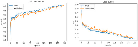 We trained the model for 200 epochs, where each epoch comprised 46 batches with 5 images per batch, as shown in Figure 6, where the left side is the curve of metric change of the model on the training set and the validation set, and the right side is the curve of loss change. Our dataset can support the training of U-Net model with the loss value and the Jaccard index of 0.07 and 0.93, respectively.