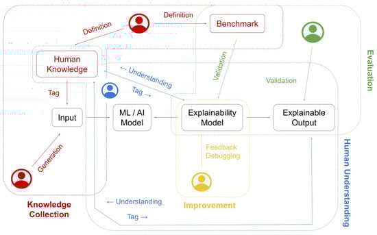 In the figure, the four main ways to use of human knowledge in explainability are represented, namely, knowledge collection for explainability (red), explainability evaluation (green), understanding human’s perspective in explainability (blue), and improving model explainability (yellow). In the schema, the icons represent human actors.