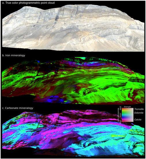 Example visualizations showing part of the Maarmorilik dataset, including (a) true-color RGB projection of the photogrammetric pointcloud, (b) a false-color composite iron index (red = Fe3+, green = Fe2+, blue = FeOH in e.g., chlorite or biotite), and (c) a minimum wavelength map sensitive to carbonate mineralogy.