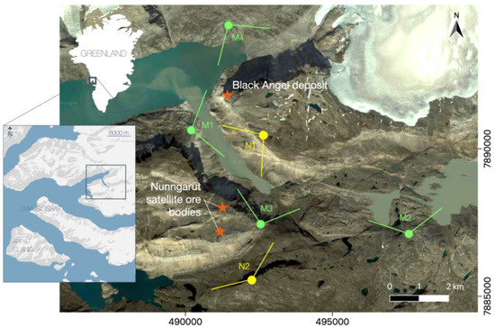 Location of Maarmorilik and surrounding hyperspectral scanning positions M1–M4 and N1–N2 (reference system: UTM 22 N. Imagery from Google Earth Inc., Mountain View, CA, USA, 2018).