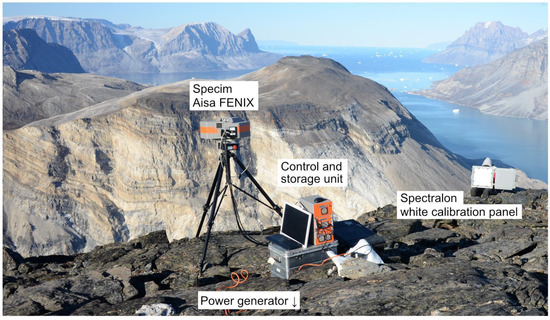 For data acquisition, a SPECIM AisaFENIX hyperspectral push-broom scanner was operated from a tripod with a rotary stage (Figure 3). This hyperspectral camera acquires data in the visible and near-infrared (VNIR) to short-wave infrared (SWIR) range in a line of 384 pixels with 624 spectral bands. The spectral resolution of the sensor varies between 3.5 nm in the VNIR range (380–970 nm) to 12 nm in the SWIR (970–2500 nm). Acquisitions were performed between 21–22 August 2016 (Table 1), during which the hyperspectral camera was deployed on cliffs at six locations around the Black Angel Mountain and Nunngarut peninsula, respectively (Figure 2). The distance from the scanning positions to the target varied from between 1 and 4 km, resulting in a mean ground sampling distance of between 2 and 5 m (Table 1). At each location, a series of three to six consecutive datasets were captured (using identical exposure settings), and the GPS position of the camera, acquisition time and general viewing direction of the scan were recorded. A Spectralon™ white reference panel (with >99% reflectance in the VNIR and >95% in the SWIR) was set up within the field of view and in an orientation similar to the outcrop for characterizing the illumination conditions. The reference was set 10–20 m away from the sensor to ensure a sufficient pixel coverage. Atmospheric conditions during data acquisition were overall dry and sunny, but locally hazy, possibly due to upwelling water vapor from the Affarlikassaa and Qaamarujuk fjords.