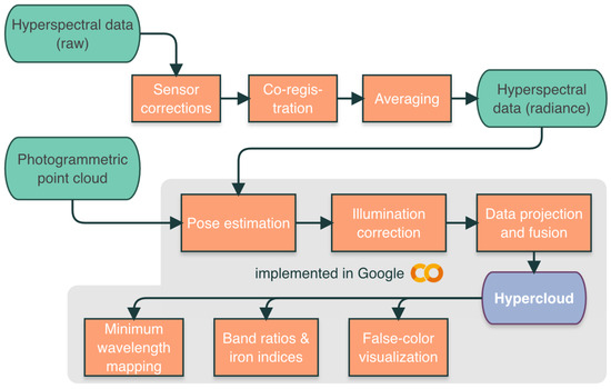 We recently developed and published open-source software tools for the accurate processing of oblique hyperspectral scenery, including geometric, atmospheric and topographic corrections [1,2,3]. Several of those procedures are compiled in the open-source python package hylite [4], which, for the first time, provided a comprehensive and open-source workflow for the creation of fully corrected reflectance hyperclouds and their basic analysis.