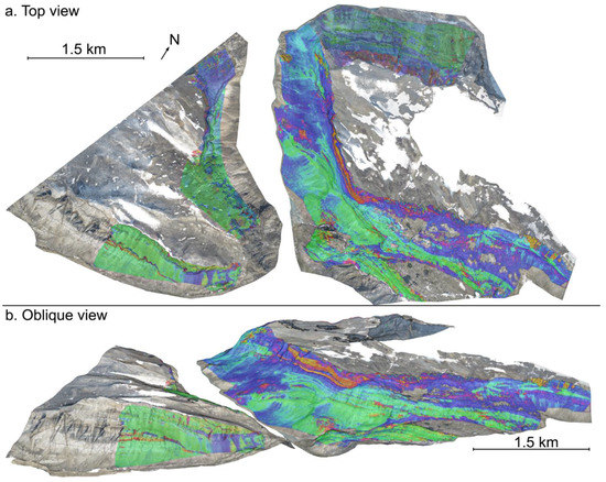 Visualizations of the three main absorptions in the SWIR range created by mapping the absorption depth and position to the saturation and hue (respectively) [15] resolves more subtle variation in mineralogy within the Maarmorilik marbles, especially in the carbonate units. The geometries outlined by contacts between the calcitic and dolomitic marbles (Figure 7) highlight a structural complexity that is not apparent using only RGB data from photogrammetric overflights. An interpretation of these geometries is beyond the scope of this data descriptor, but is the subject of an accompanying paper [5].