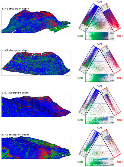 Top (a) and oblique (b) view of the four hyperclouds (M1, M4, N1 and N2). Colors are saturation-enhanced hull-corrected absorbance at 2200, 2250 and 2350 nm. Background RGB values are from the photogrammetric point cloud.