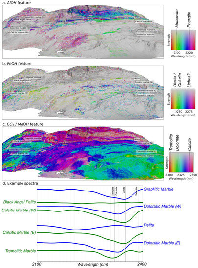 These results can distinguish, e.g., metapelite spectra dominated by the AlOH absorption from carbonate spectra dominated by the CO3 absorption. The metapelite units can also be distinguished by the comparatively low albedo (dark color) and the presence (in some areas) of absorption features associated with white micas (notably the Al–OH vibrational overtone located at ~2200 nm) [31] and biotite or chlorite (the Fe–OH vibrational overtone at ~2250 nm) [31].