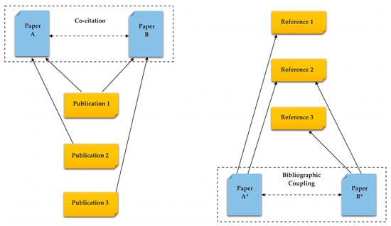 As depicted in Figure 1, the left panel reflects that papers A and B could be one linkage connected through co-citation analysis since these have been both referenced by the first publication. The bigger the number of co-citations two papers receive, the greater their co-citation strength and the greater the likelihood that they are substantially connected [53]. In contrast, the right panel emphasizes a connection between references from articles A* and B*, as both of them cite the second reference. Specifically, two articles may cite the same resources. However, any two articles listed in another’s citation constitute bibliographical coupling [54,55]. Bibliographic coupling predates co-citation by several generations, yet co-citation analysis has been claimed to be more advanced than other bibliometric techniques in reflecting domain structures [56].