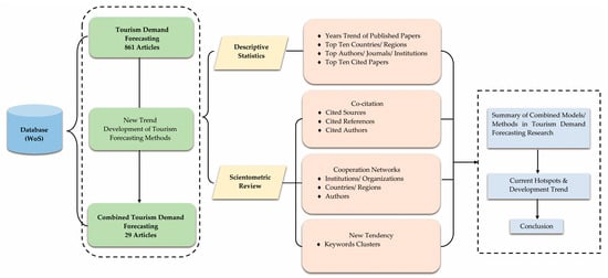 However, tourism research has been described as dispersed, fragmented, and diverse [16,17]. Tourism forecasting fields refer to, among other terms, tourism demand, tourism demand forecasting, tourism demand volatility, tourism demand volatility forecasting, combined tourism demand forecasting, and combined tourism demand volatility forecasting. Notably, no systematic evaluation of the evolution of mixing several topics in tourism forecasting has been conducted, and bibliometric research on this topic has been reported less frequently. Furthermore, one of the three types of bibliometric procedures—review, evaluative, and relational studies—relational is the least used in tourism. Despite the abundance of publications and methods supporting tourism forecasts, bibliometric analysis knowledge mappings in the field and various topic explorations and comparisons have been sporadically visualized in previous research reviews. As a result, little knowledge has been published regarding the capabilities of mappings to reveal general structures [18,19].