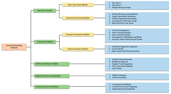 Throughout the previous three to four decades, a multitude of tourism forecasting models have been proposed, each attempting to investigate the underlying reason for visitor volatility and develop precise projections for tourist arrivals [83]. Most of these studies employed multiple methods, which can be divided into five types: (1) time series models, (2) econometric models, (3) artificial intelligence (AI) models, (4) judgmental forecasting methods, and (5) combined and hybrid methods, as described in Figure 3. Based on the most fundamental models or methods, scholars can investigate and build further models in the field of tourism demand forecasting.