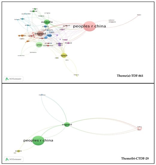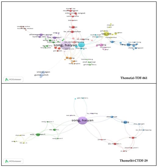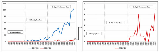 The two graphs show the temporal trend of publications between 1980 and 2021. The evolution of each collection over time can be examined and evaluated by referring to Figure 4. In the first emerging phase (1980 to 1990), the number of publications produced per year was negligible at almost zero. From 1991 to 2004, four papers were produced each year within Theme(a)-TDF-861 in the second pick-up pace phase. As for the third rapid development phase, Theme(a)-TDF-861 displays experienced growth with volatility as the volume of papers climbed to approximately 35/year. Remarkably, this phase exhibits a mushroomed trend due to the fluctuations for Theme(b)-CTDF-29. This theme has the potential to become a new area of interest for future research.