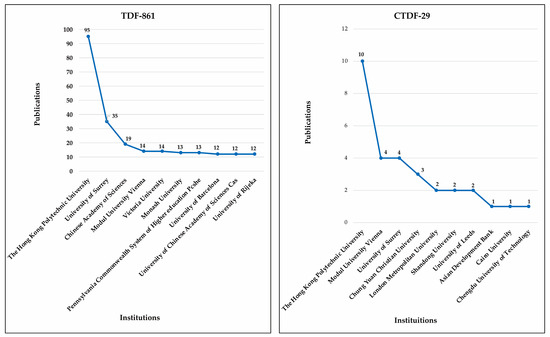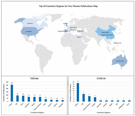 The publications in distinct countries/regions relating to the two primary themes are depicted in the map and bar charts shown in Figure 5. Regarding the TDF-861 theme, the top three high-yielding countries/regions are China (259 publications), the UK (94 publications), and the USA (89 publications), accounting for about 30.08%, 10.92%, and 10.34% of published articles, respectively. As for CTDF-29, in terms of total publishing volumes, China accounts for 56.67% (17), the UK for 23.33% (7), and Taiwan (China) for 16.67% (5). Overall, China and the UK have become the most prolific countries, as inferred from the two-bar charts.