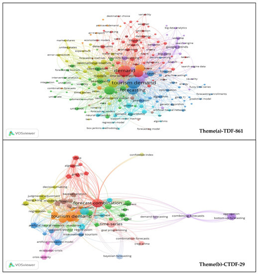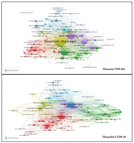 As inferred from Table 4, the distribution indicates the top 5 high-yield publications. Tourism Management (impactor factor: 10.967) leads with 65 and 5 publications, respectively, in the TDF-861 and CTDF-29 themes, followed by Tourism Economics (impact factor: 4.438) with 63 articles in Theme(a). Annals of Tourism Research (impact factor: 9.011) has 55 and 6 publications, respectively, on the two themes. The International Journal of Forecasting (impact factor: 3.779) presents 24 and 2 papers on two themes, respectfully. In general, except for the tourism demand field, publications about tourism forecasting published highly influential publications. However, it is evident that just 29 papers on combined tourism make up a very small proportion of all publications in the tourism forecasting area, resulting in the publication of relatively few articles in the above-mentioned prestigious journals. In contrast, Table 4 does not provide the relationships from data relationship visualization in addition to static data. If only these data were considered, it would be difficult for readers to comprehend the relevance of the content in each journal and article. Consequently, the next section of the scientometric knowledge network mapping’s description allows readers to collect and analyze the dynamic links between journals and papers as well as other evaluation criteria in the field of tourism forecasting research.