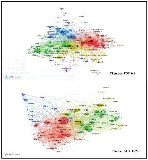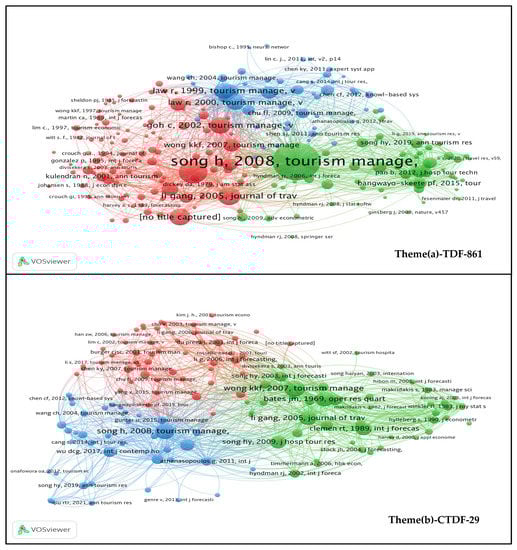 According to Figure 9, the cited authors were retrieved within the network through meeting a frequency, citations(C), linkages(L), and total link strength (TLS). The threshold was limited between 200 and 300 in each of the two themes. These top three authors are presented in order of their initial year of co-citation, Theme(a)-TDF-861: Song H.Y., (516C, 215L, 16219TLS), Witt S.F. (443C, 216L, 11304TLS) and Law R. (392C, 216L, 10007TLS); Theme(b)-CTDF-29: Song H.Y. (55C, 139L, 2910TLS), Lim C. (23C, 122L, 1472TLS) and Chu F.L. (24C, 116L, 1421TLS). These two concepts all revolve around Song H.Y. In addition, all authors were engaged in tourism demand forecasting context research or combined tourism demand forecasting context research between 1980 and 2021, showing that they conducted the associated research in an ongoing manner. Therefore, upgrading subjects, such as the TDF and CTDF themes, would rely on the collaboration of academics from comparable domains.