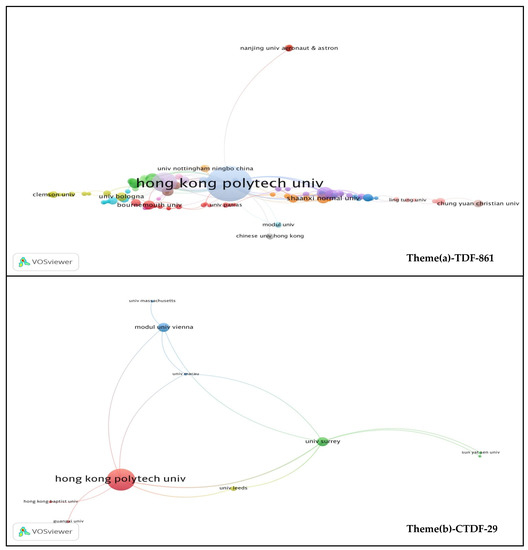 For 1980–2021, institutions’ cooperation knowledge network mappings included corporation ties depicted in Figure 10: Theme(a)-TDF-861, with a total of 397 links (L), in order, including The Hong Kong Polytechnic University (110L), University of Surrey (49L), Chinese Academy of Sciences (32L), University of Chinese Academy of sciences (20L), Sun Yat-sen University (17L) and Bournemouth University (15L). Theme(b)-CTDF-29 exhibits a total of 18 links within The Hong Kong Polytechnic University (9L), University of Surrey (9L), Free University of Bozen-Bolzano (6L), Leeds Beckett University (6L), and North-West University (2L). In total, numerous themes are associated with multiple organizations. The Hong Kong Polytechnic University represents a prominent producer and a pioneer in academic tourism forecasting research from a quantitative scope across institutions. Likewise, the Chinese Academy of Sciences, Henan University, Fujian Normal University, Shanxi Normal University, and Guangxi Normal University are among the mainland Chinese universities with whom The Hong Kong Polytechnic has ties.