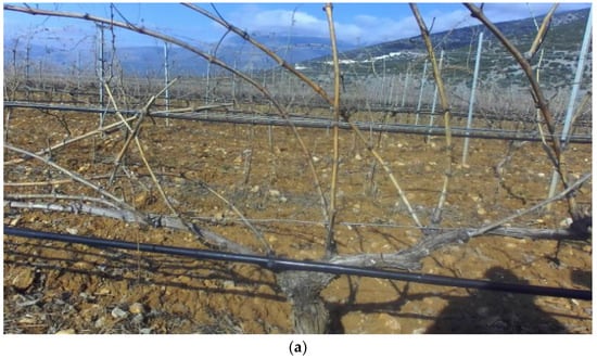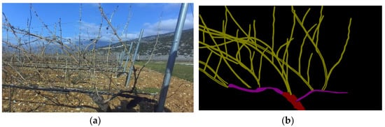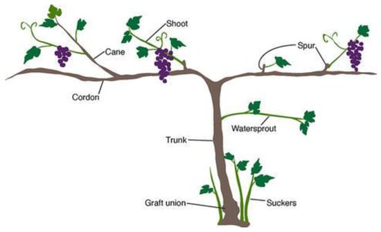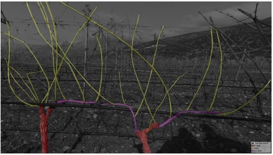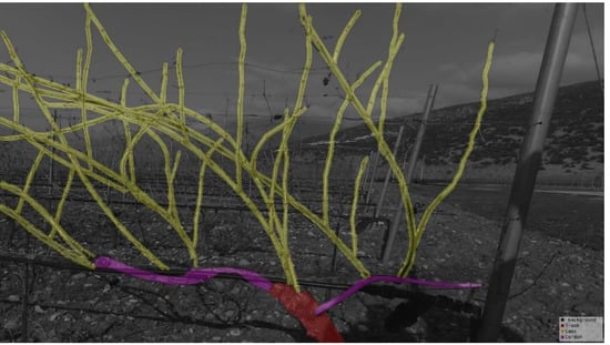Grapevine pruning poses a difficult problem if a specific automation solution is required. From the agricultural domain, it is known that a grapevine is separated into different parts. Based on this knowledge, several attempts by computer vision and the image processing research community have been made to solve the problem through image data processing, with the support of stereoscopic cameras [1,2] and 3D laser scanners [3,4]. Most of these are non-invasive approaches, except [4] when a robotic system is used for grapevine pruning, based on image processing and computer vision methods. Other proposed publications are based on RGB images without the addition of distance estimation or other real-world attributes. These methods, with the support of real-world attributes from the scene, aim to decompose the grapevine from given images [5,6,7,8] to achieve a pruning cutting points estimation. The grapevine structure consists of three basic parts, (a) the trunk, which is the larger woody part of the plant, (b) the cordons, which are thinner than trunks and of which there are usually two in each plant, and (c) the canes starting on the top of cordons, which are the thinner woody parts of the plant and the tallest, as presented in Figure 1.