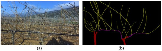 Image data sample of grapevine plants skeletons showing: (a) RGB image of the plants’ skeletons and (b) annotated mask of RGB image.