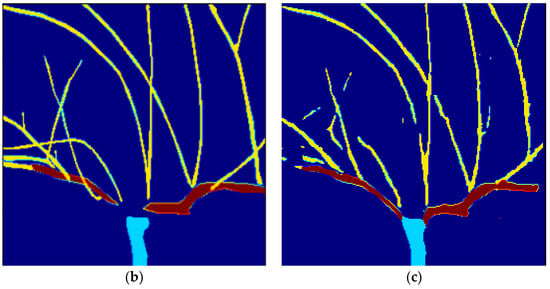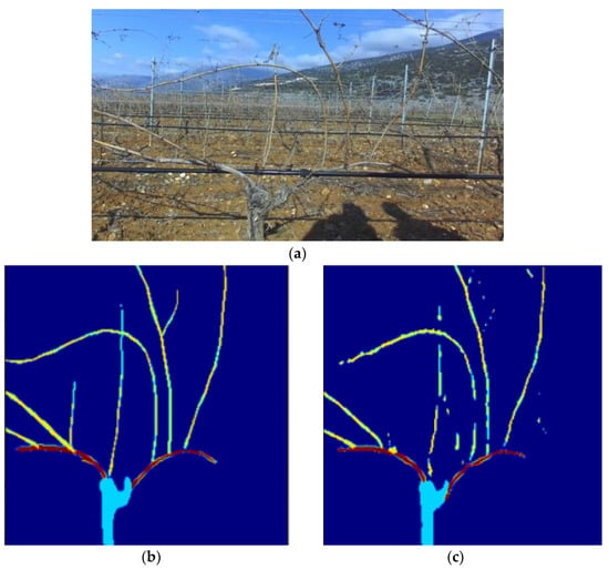 Some basic visual characteristics of the plant are the fact that the trunk is always vertical, the cordons are horizontal, and the canes are in a random direction with a vertical formation. In the winter, during grapevine pruning, the shoots, spurs, suckers, and water sprouts do not exist. As mentioned above, the basic concept of pruning is to remove the last year’s canes from the cordons and let the new canes grow to give new grapes [10]. This leads to the conclusion that canes are the object of interest in this specific problem. Grapevine pruning via computer vision and image processing has been proven to be a very challenging problem, since canes are increasing in length, in random directions, and very near each other. This structure creates a high overlap between objects of interest, and, with the addition of a complex background and noise from the environment, image analysis is very difficult, especially for an invasive approach where a robotic system must take action. Another challenge in this problem is the complex background, where a grapevine image will contain not only the foreground plant but also the background, especially during winter, when the grapevine has no leaves at all. Finally, each winery applies different pruning strategies, such as pruning some canes completely and just shortening the rest. Different pruning strategies add some constraints to the problem, which makes it more complex than simple. A feasible solution is the usage of stereoscopic cameras, where, based on an RGB image and depth map (real distance values), the foreground and background could be separated in a given image [2]. The above issues justify why most studies in the literature focus on non-invasive approaches [1,2,3,5,6,7,8], where background and foreground algorithms, object detection [7], and segmentation [6] deep learning algorithms have been used without pruning points’ estimation. In invasive approaches [4], a closed environment surrounds the plant to be pruned with the support of robotic arms and computer vision methods based on 3D data processing. Despite the pruning, canes should also be removed, and in a fully automated scenario, the pruning strategy might change from the classical approach, since robotic manipulators with the support of cameras cannot mimic humans completely. Achieving this through image analysis means that all canes should be segmented in order to extract the whole canes’ bodies for cutting point estimations on them. Semantic segmentation is a very popular method in robotic systems that interact in a wild-free environment. With this approach to grapevine pruning, automation methods can achieve cutting point estimations or feature extraction mechanisms, since the whole area of interest is segmented. Pruning could be characterized as a problem for which it is very hard to find robust solutions, since vineyard plants do not have more than a 3 m distance from each other and have a very complex structure. Based on the above issues, the objectives of this study are: