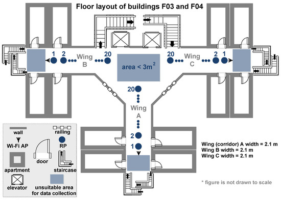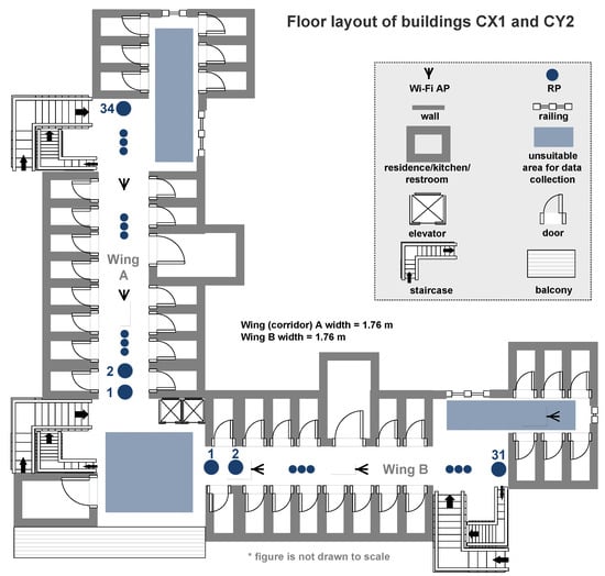 The AP available in each wing was preinstalled at the specific location. From Figure 1, it is evident that the deployment of an AP targeted network coverage to apartments present within the wing. The data collection Reference Points (RPs), as illustrated in Figure 1, cover the three corridors, one in each wing. Furthermore, Wi-Fi data were also captured at a significant portion of the central open space. More precisely, the RPs and TPs beyond RP#18 are located beyond the narrow corridor walls of each wing. Training and test data were collected at 18 different locations in the central open areas on two levels of building F04. Figure 2 illustrates the floor layout of the buildings CX1 and CY2.