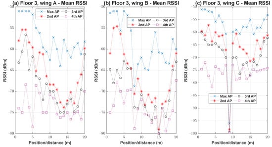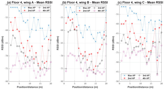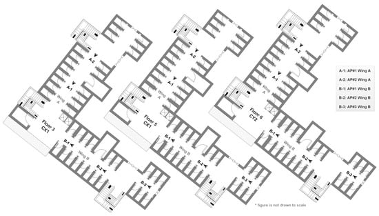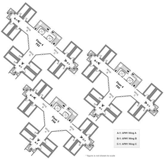 The APs available in each wing and floor were preinstalled at the specified locations. From Figure 2, it is evident that the APs installment targeted wireless network coverage to resident rooms present within the wing. The buildings CX1 and CY2 have two wings on each floor. In building CX1, the central spaces connecting both wings were not feasible for data recording, as they were dedicated for common seating, dining, laundry, and indoor recreational activities on several floors.