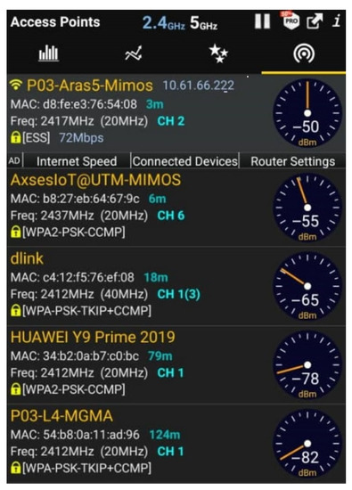 All access points installed within all buildings were identified using two Android smartphones running a free Wi-Fi analysis application. The freely available Android Application ‘WiFi Analyzer’ [64] was leveraged for identification of all preinstalled APs in the four buildings. This application is capable of displaying information of detectable 2.4 GHz and 5 GHz Wi-Fi networks. Identification of an AP was carried out by running the Android application when the smartphones were at the closest possible vicinity to the particular AP. The MAC address of the AP showing highest signal strength (RSSI) on the application (of both smart phones) was noted and identified. All deployed access points were identified as dual-band, operating in 2.4 GHz and 5 GHz frequencies. A screenshot of the Android application used, is reported as Figure 5.