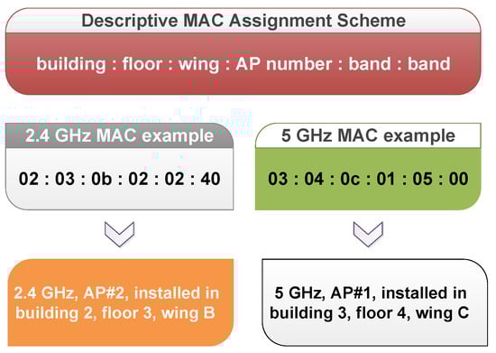 As mentioned earlier, all access points installed operate in 2.4 GHz as well as 5 GHz, with separate MAC for both bands. Therefore, the identified APs were further labeled by assigning descriptive unique dual-band MAC addresses. The descriptive MAC addresses were formulated as per the scheme illustrated in Figure 6.
