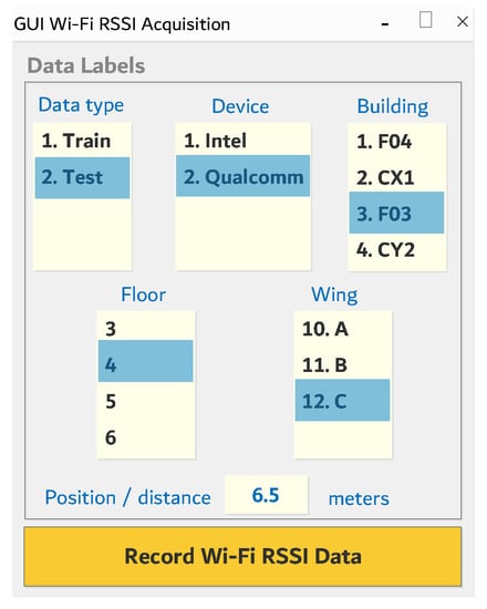 The data acquisition application was developed to systematically capture, label, organize, and store RSSI data, ensuring convenience for prospective research works. Figure 7 is a sample snapshot of the specifically developed data acquisition application’s Graphical User Interface (GUI).