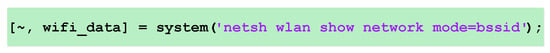The data acquisition application captured RSSI data of Wi-Fi APs by, invoking a Windows® system command available for wireless networks analysis. A snapshot of the exact MATLAB® command incorporated in the recording application is provided in Figure 8.