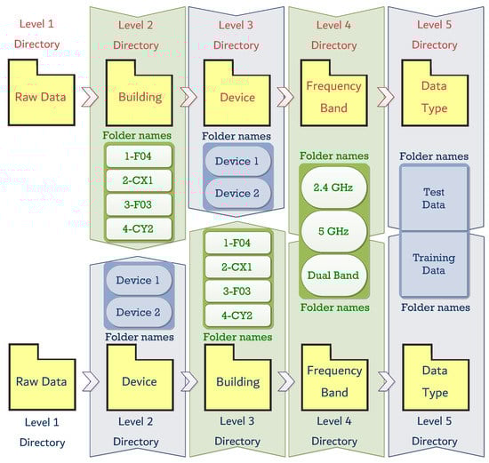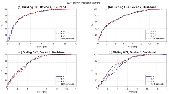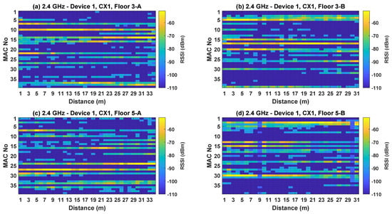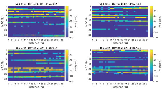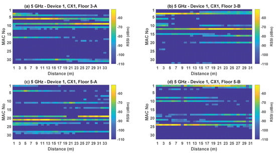 In order to promote fair comparison among proposed solutions and foster future indoor localization research, certain open access datasets [19,20,21,22,23,24,25,26,27] provide valid Wi-Fi data for indoor positioning. Wi-Fi data collected in a particular indoor environment are generally not useful in other indoor locations. The reason for this is because the repeatability of data is affected by variations in the indoor layouts, networks, and measurement devices [28]. Despite the homogeneity of these factors, the spatial variations in how network devices are installed also affect the repeatability of Wi-Fi data [23,29]. Due to the lower variability in Received Signal Strength Indicator (RSSI) that has been observed with dual-band Wi-Fi data, recent works [30,31] have advocated the use of dual-band data for accuracy improvements in indoor positioning.