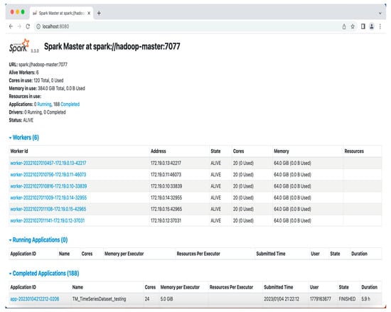 UWF’s Spark cluster consists of one Spark master and five Spark workers. Apache Spark is a multi-language engine for executing data engineering, data science, and machine learning on single-node machines or clusters [23]. The cluster runs Apache Spark Version 3.2.1 (Apache Software Foundation, United States) on Redhat Enterprise Release 8 (Figure 4). The cluster has a storage capacity of 460 GHz/200 cores and 640 GB of memory.