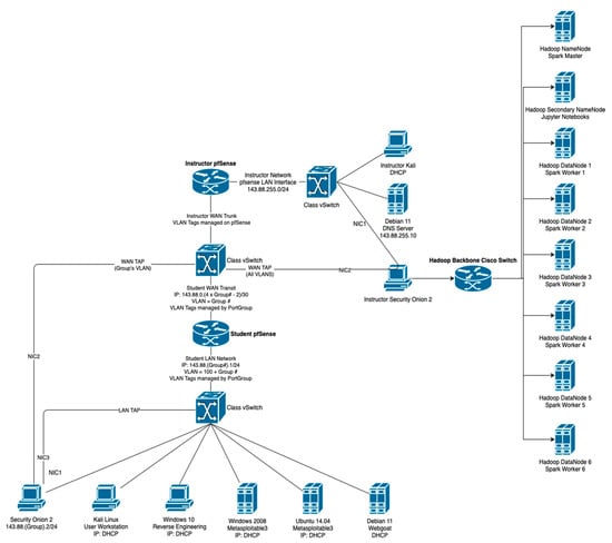 This VMware vCenter allowed access to virtualized networks from the Internet via a hypertext markup language version 5 (HTML5)-compatible web browser. Network principles were practiced with the aid of pfsense, which acted as a router with a built-in firewall. Offensive cyber operations (OCO) (e.g., red team or penetration testing) were practiced in the safety of the closed virtualized networks provided by the UWF cyber range using Kali Linux, implementing the full Lockheed Martin kill chain (e.g., the use of EternalBlue) [25]. Kali Linux is an open-source penetration-testing, security-research, computer-forensics, and reverse-engineering distribution based on Debian Linux [26]. Defensive cyber operations (DCO) and network operations (NetOps) (e.g., blue team, hunt, network monitoring) were conducted using Security Onion with both built-in and custom IDS rules via Snort and Suricata, and analytics using Elastic Stack dashboards and visualization were used to detect events. Security Onion is a free and open-source threat-hunting, network-security-monitoring, and log-management platform including best-of-breed open-source tools (e.g., Zeek, Wazuh, and Elastic Stack) [27]. A target-rich and diverse environment was provided by both Windows and Linux variants of Metasploitable. Metasploitable is a virtual machine with numerous built-in security vulnerabilities (e.g., security vulnerabilities found in GlassFish, Apache Structs, Tomcat Jenkins, IIS FTP, IIS HTTP, psexec, SSH, WinRM, Chinese caidao, ManageEngine, ElasticSearch, Apache Axis2, WebDAV, SNMP, MySQL, JMX, Wordpress, SMB, Remote Desktop, PHP MyAdmin), which are intended to be exploited using Metasploit, such as the Metasploit Framework found in Kali Linux [18]. These VMs formed the bases of our virtualized networks, but many other VMs and services have found their way into the network for research and educational purposes (e.g., Splunk, CentOS, Windows XP, Windows 7, Windows 10, lightweight directory access protocol (LDAP), active directory (AD)). Pfsense, Kali Linux, Security Onion, and Metasploitable were arranged in such a manner that each group had their own network (Figure 5).