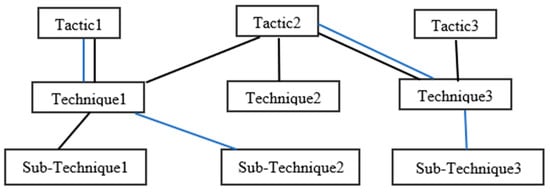 The quick response offered by the MITRE ATT&CK framework after identifying new adversarial behavior is created by adding a new technique or sub-technique and making the existing technique or sub-technique inclusive of the new adversarial behavior. Some techniques were originally very broad, having the capacity to add sub-techniques, hence limiting the need to create new techniques every time. However, each sub-technique will only have a relationship with a single parent technique, and the sub-technique is not required to fall under all tactics that a technique is in. This is shown in Figure 6 with the blue lines. Sub-technique2 falls under Technique1 and Tactic1, but not Tactic2, although Technique1 falls under both Tactic1 and Tactic2. Similarly, Sub-technique3 falls under Technique3 and Tactic2, though Technique3 falls under both Tactic2 and Tactic3. This presents an interesting problem for the data structure and how the data is stored, which is discussed briefly in the latter part of this paper.