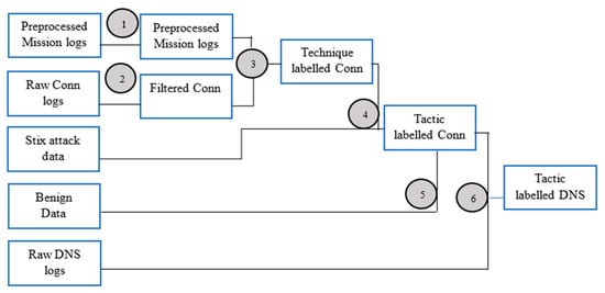 One of the major challenges faced in creating this dataset was mapping and labelling the attacks or Zeek logs as per the MITRE ATT&CK framework. This was conducted with the help of the mission logs and is detailed in the next couple sections. We present the pseudo-algorithms used to label two data files: the DNS data file and a similar sub-set of the DNS mappings that were used to label the Conn data files.