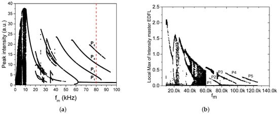 To understand the dynamics of the EDFL, the bifurcation diagram of the local maxima of the laser intensity as a function of the pump modulation frequency is calculated. To perform numerical simulation, the equations are described in Equation (1). The normalization procedure and further details can be found in the appendix of reference [9,13,14,15], and the system coefficients are described in Table 1. At a modulation amplitude , the laser system exhibits dynamic richness by varying the modulation frequency, showing a bifurcation diagram as in Figure 1a.