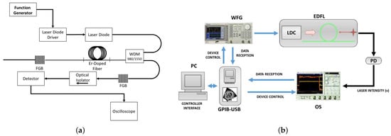 Experimental setup. (a) Optical elements required to put the erbium-doped fiber laser into operation. (b) Elements required to implement the logic gate based on the operation of the EDFL. (WFG—Wave Form Generator; LDC—Laser Diode Controller; PD—Photo-Detector; WDM—Wavelength Division Multiplexing; OS—Osciloscope; FGB—Fiber Bragg Grating).