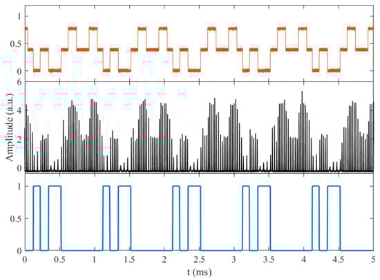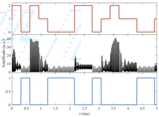 For example, the file shown in Figure 4 (black line), named “INTLAS_40_8.dat”, corresponds to the response of the laser at a modulation of 40 kHz and a digital signal amplitude of V, where the input signal that excites the system is contained in the file “DIGINP_40_8.dat” shown in Figure 4 (red line).
