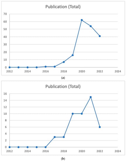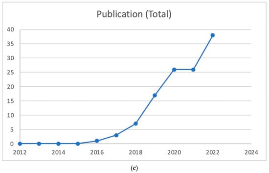 Exploring the development phase, knowledge accumulation, and maturity of blockchain is made more accessible by the annual pattern of publishing activity that characterizes blockchain research. Table 4 presents the yearly research paper publications from 2012 to 2022. As presented in Figure 1a, the number of publications about blockchain storage was at an initial stage between 2012 and 2015, but there was a slight increase in the number of publications between 2016 and 2018, and it reached its peak in 2020. Later, the number of publications decreased slightly during 2021–2022. Similarly, in Figure 1b, the number of publications about blockchain scalability is at an initial stage between 2012 and 2015. Still, there was a slight increase in publications between 2016 and 2018, which peaked from 2012 to 2022. Moreover, in Figure 1c, the number of publications about blockchain availability was at an initial stage between 2012 and 2016. Still, there was a slight increase in the number of publications between 2017 and 2018, and it peaked in 2021. Later, the number of publications will decrease in 2022. In the present studies, we have taken the data source from Scopus database for the bibliometric analysis.