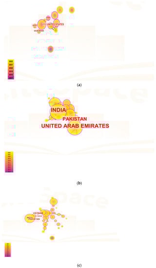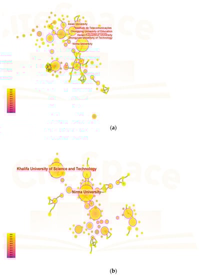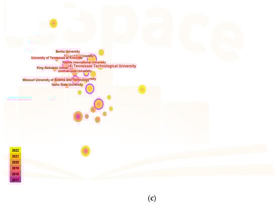 Several research institutions were substantially concentrated, as seen in Figure 3a–c, (factor settings: year(s) per slice: 1; node type: institution; pruning: pathfinder and pruning the merged network; top N per slice: 50; top N%: 10%). The visualization map of institutions/countries involved in blockchain storage, blockchain scalability, and blockchain availability research: Mapping of central countries involved in blockchain storage, blockchain scalability, and blockchain availability research; Mapping of institutions engaged in blockchain storage, blockchain scalability, and blockchain availability research (the table above lists the top 10 publishing institutions).