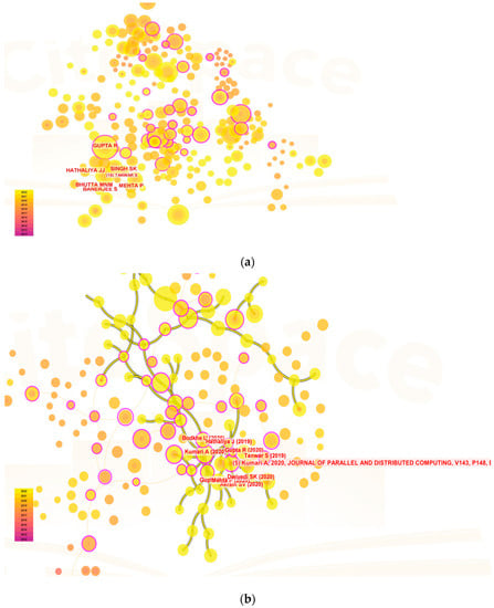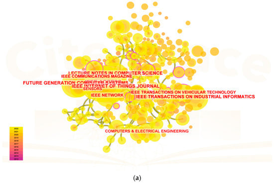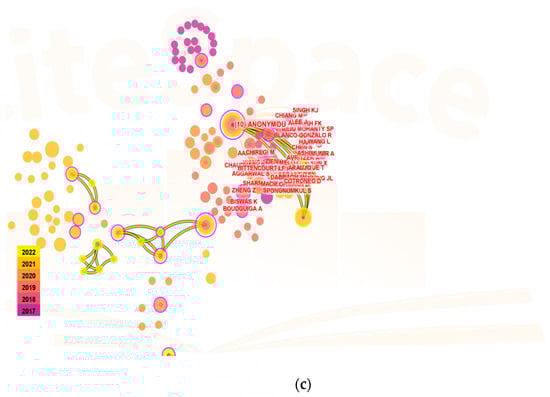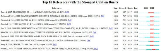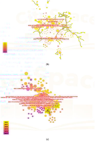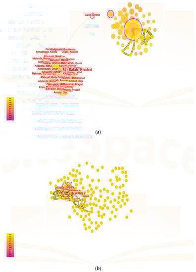 In terms of the co-authorship analysis in Figure 5a–c, each node represents one author (parameter settings: year(s) per slice: 1; node type: cited author; pruning: pathfinder and pruning the merged network; top N per slice: 50; top N%: 10%). In the charts generated by CiteSpace, mapping showed the most co-cited authors related to blockchain storage as Tanwar Sudeep and Gupta Rajesh between 2012 to 2022, along with their journals as Computers and Industrial Engineering and 2022 IEEE Globecom Workshops (GC Wkshps). Mapping in blockchain scalability showed the most co-cited authors as Kakkar Riya and Gupta Rajesh between 2012 to 2022 along with their journals as IEEE Systems Journal and IET Communications. Mapping in blockchain availability showed the most co-cited authors as Anonymous and Dorri Ali between 2012 to 2022 along with their journals as IEEE Access and Journal for General Philosophy of Science.