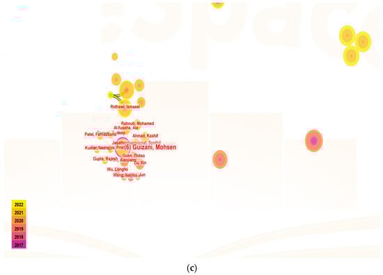 Based on extracted data for Figure 4a–c (parameter settings: year(s) per slice: 1; node type: author; pruning: pathfinder and pruning the merged network; top N per slice: 50; top N%: 10%) from 2012 to 2022, the topmost productive authors were found in the form of mapping. Each node includes the name of a specific author, and this diagram shows Salah Khaled as the most influential author related to blockchain storage research. Moreover, Gupta Rajesh is the most influential author of blockchain scalability research, and Guizani Mohsen is the most influential author of blockchain availability research.