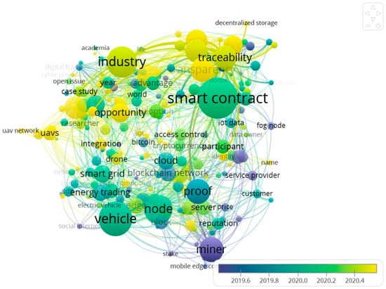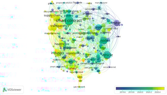 The country cooperation network of blockchain storage research is displayed in Figure 2a, blockchain scalability in Figure 2b, and blockchain availability in Figure 2c (parameter settings: year(s) per slice: 1; node type: country; pruning: pathfinder and pruning the merged network; top N per slice: 50; top N%: 10%), with the size of nodes denoting the number of articles that were published in each country. The more nodes there were, the more papers were published.