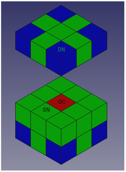 Now, we iterate over the OCC array i: = 0 to m (m = length of OCC), fill the corresponding OCSPACE(OCC[i,0]) array item with OCC[i,1] (the number of points), and increase the neighbor (+X axis) OCSPACE[:,1] item with OCC[i,1]/10, and increase the −X axis OCSPACE[:,1] item with OCC[i,1]/10 and perform it in the Y and Z axis. We perform similarly on the twelve edge neighbors (+X, +Y, Z; −X +Y Z; +X −Y Z;…), but we store the result in OCSPACE[:,1]. With these values, we can calculate the SNC (SN count) and the DNC (DN count) values.