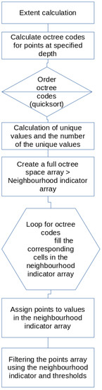 Our objective was that the novel algorithm has to meet two requirements: having similar parameterization and output as the ROL filter has and not having a procedure that causes exponentially growing computations with the increasing number of points. The algorithm was developed with speed and memory efficiency in mind to handle extra large point clouds. One crucial goal is to avoid using floating-point arithmetic since it is much slower for all processor types than the using integer arithmetic, and linear time complexity should be pursued. The new algorithm uses an octree since the time required to build the octree is . When computing the filter, we can determine all the necessary indicators in one step, so the time required for filtering is .