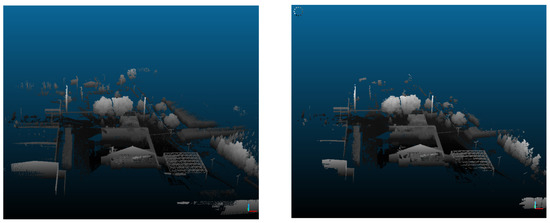 Each of the following figures (Figure 3, Figure 4, Figure 5 and Figure 6) consists of two images: the left-hand one shows the original point clouds, while the right-hand one is the point cloud after running OCD (the clouds are colored with a height ramp). Figures prove that our algorithm could cope with removing outliers caused by vegetation, measured points with a low incidence angle, points resulting from device positioning error. The most spectacular difference can be observed on the mobile scan (Figure 4); this point cloud has a typical scanner positioning error that results in semicircular outlier points. All of these points were removed by our algorithm successfully.