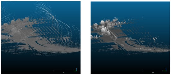 This paper focuses on laser scanning, where scans have different characteristics depending on the device used to obtain the data. For example, object scanning provides a contiguous surface; in the ALS (Airborne Laser Scanning), the Z coordinate refers to the elevation, TLS (Terrain Laser Scanner) generated point clouds result in fragmented surfaces, mobile laser scans produce large data sets, while sensors collecting data for autonomous driving (AD) generate point cloud streams (for example, snowfall is often a problem with TLS, especially in autonomous driving [2,3]). Point cloud types have their typical size (Table 1) too, but as mentioned previously, we usually need to exclude some points from further processing for different reasons.