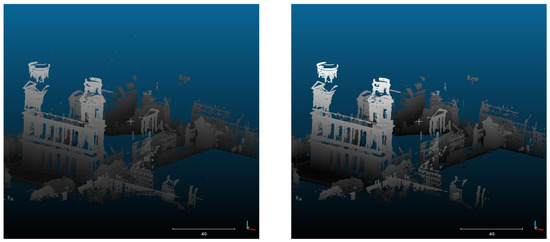 Temple (original and filtered). Distant noise points disappeared, extent reduced.
